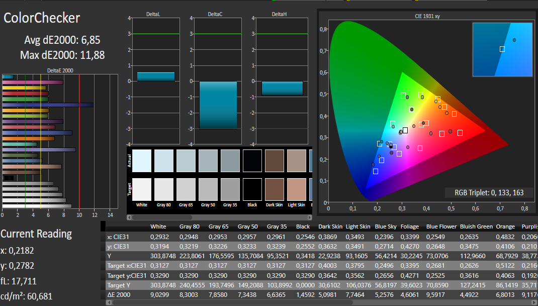 ΔE ColorChecker Calman: 6.85 | ∀{0.5-29.43 Ø4.79}