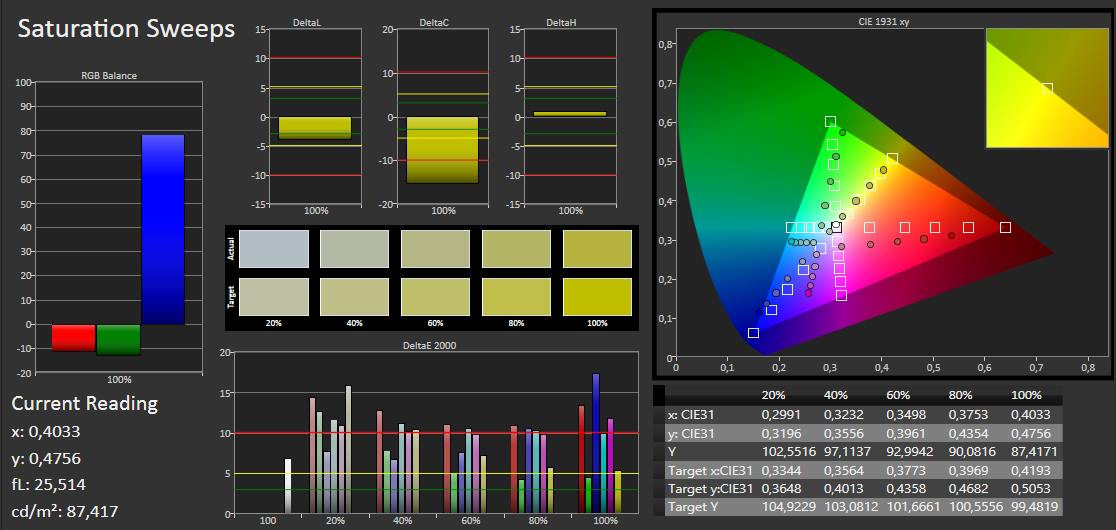 Im Auslieferungszustand haben wir den Bildschirm vermessen (Zielfarbraum sRGB) und konnten dabei eine durchschnittliche DeltaE-2000-Abweichung von etwa 8,8 feststellen. Den Zielbereich (DeltaE kleiner 3) erreicht keine Farbe. Zudem besitzt der Bildschirm einen deutlichen Blaustich.