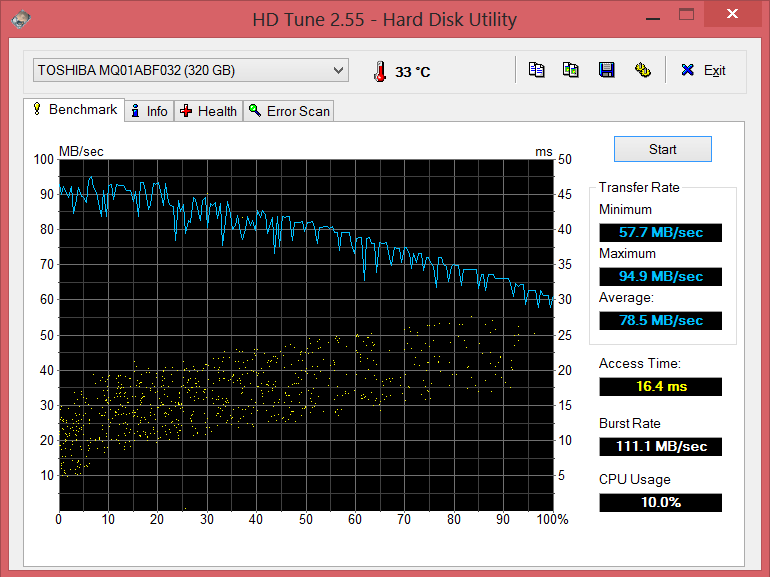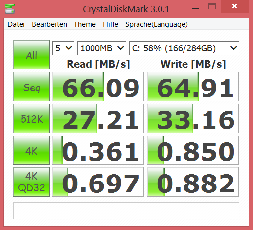 Packard Bell verbaut in unserem Testgerät eine 7 mm dünne Festplatte von Toshiba. Sie besitzt eine Kapazität von 320 GB und arbeitet mit 5.400 Umdrehungen pro Minute. CrystalDiskMark meldet eine Lesegeschwindigkeit von 66,09 MB/s. HD Tune liefert eine durchschnittliche Transferrate von 78,5 MB/s. Diese Werte fallen insgesamt sehr niedrig aus. Von durchschnittlichen 5.400er-Festplatten ist heutzutage mehr zu erwarten. Positiv hervortun kann sich die Festplatte mit ihrer geringen Zugriffszeit von 16,4 ms.